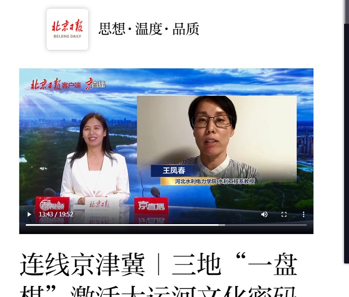 6月16日 ,《北京日报》“行走京津冀、看运河新韵”专栏刊登通讯报道《三地“一盘棋”激活大运河文化密码》,并在客户端“京直播”中视频连线我校水利工程系副主任王凤春教授,邀请其就共建大运河文化带功能进行介绍...