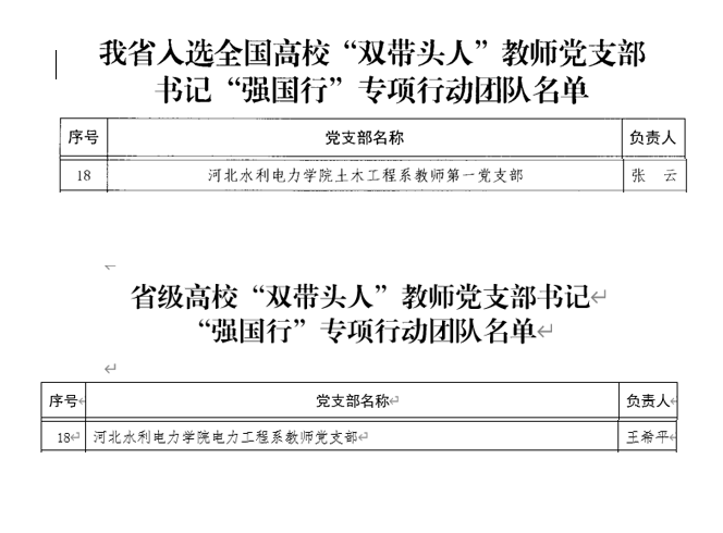 近日,教育部办公厅公布了全国高校“双带头人”教师党支部书记“强国行”专项行动团队名单,我校土木工程系教师第一党支部成功入选全国高校“双带头人”教师党支部书记“强国行”专项行动团队,电力工程系教师党支部入选河北省高校“双带头人”教师党支部书记“强国行”专项行动团队。此次活动为首批“强国行”专项行动团队评选,旨在创新落实立德树人根本任务,充分发挥“双带头人”的示范引领作用,聚焦服务国家重大战略和地方经济社会高质量发展,...