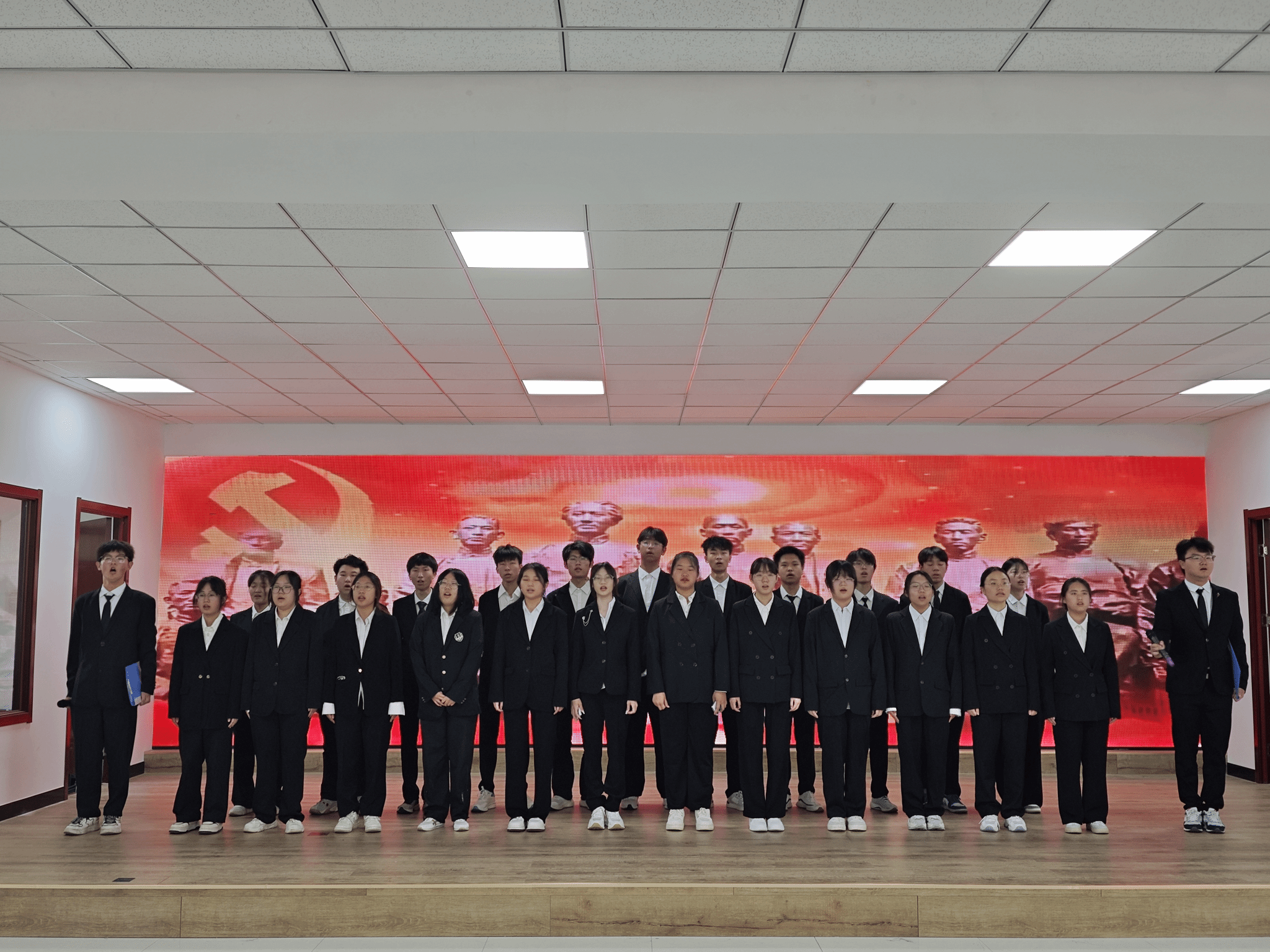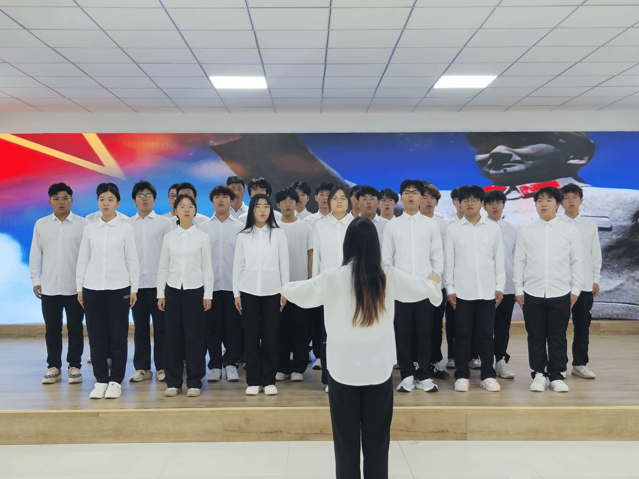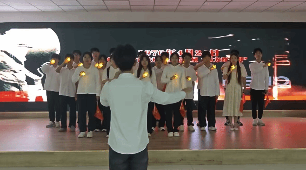 在接下来的演出中,各参赛队伍带来了多首经典红歌,每一首都承载着厚重的历史记忆和深刻的时代内涵。《强军战歌》的豪迈旋律唱出了人民军队听党指挥、能打胜仗、作风优良的铁血担当。同学们身姿挺拔,歌声嘹亮,展现出了对人民军队的崇高敬意和对国家安全的坚定守护。激昂的歌声传递出强国必须强军、军强才能国安的深刻内涵,也表达了对祖国强大军事力量的信心和自豪。
