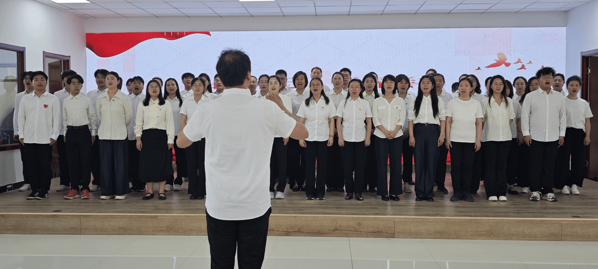 红歌会在直属单位党委党员教师代表带来的经典歌曲《没有共产党就没有新中国》中拉开帷幕。教师们整齐列队,精神抖擞。他们用坚定有力的歌声唱出了对党的深厚情感和对历史使命的担当。歌声中,大家仿佛回到了那个烽火连天的年代,感受到了革命先辈们坚定的信仰和无畏的勇气。