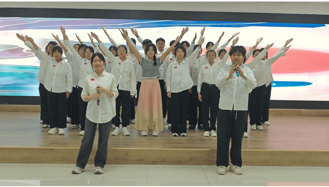“五星红旗迎风飘扬,胜利歌声多么响亮”,《歌唱祖国》的悠扬旋律让现场气氛愈发热烈。全体师生挥动手中的小红旗,与台上的演唱者一同歌唱,共同抒发对祖国的热爱与赞美。这首歌见证了新中国从站起来、富起来到强起来的伟大飞跃,此刻,它凝聚起了师生们的爱国热情,让大家更加坚定了为祖国繁荣富强而努力奋斗的决心。