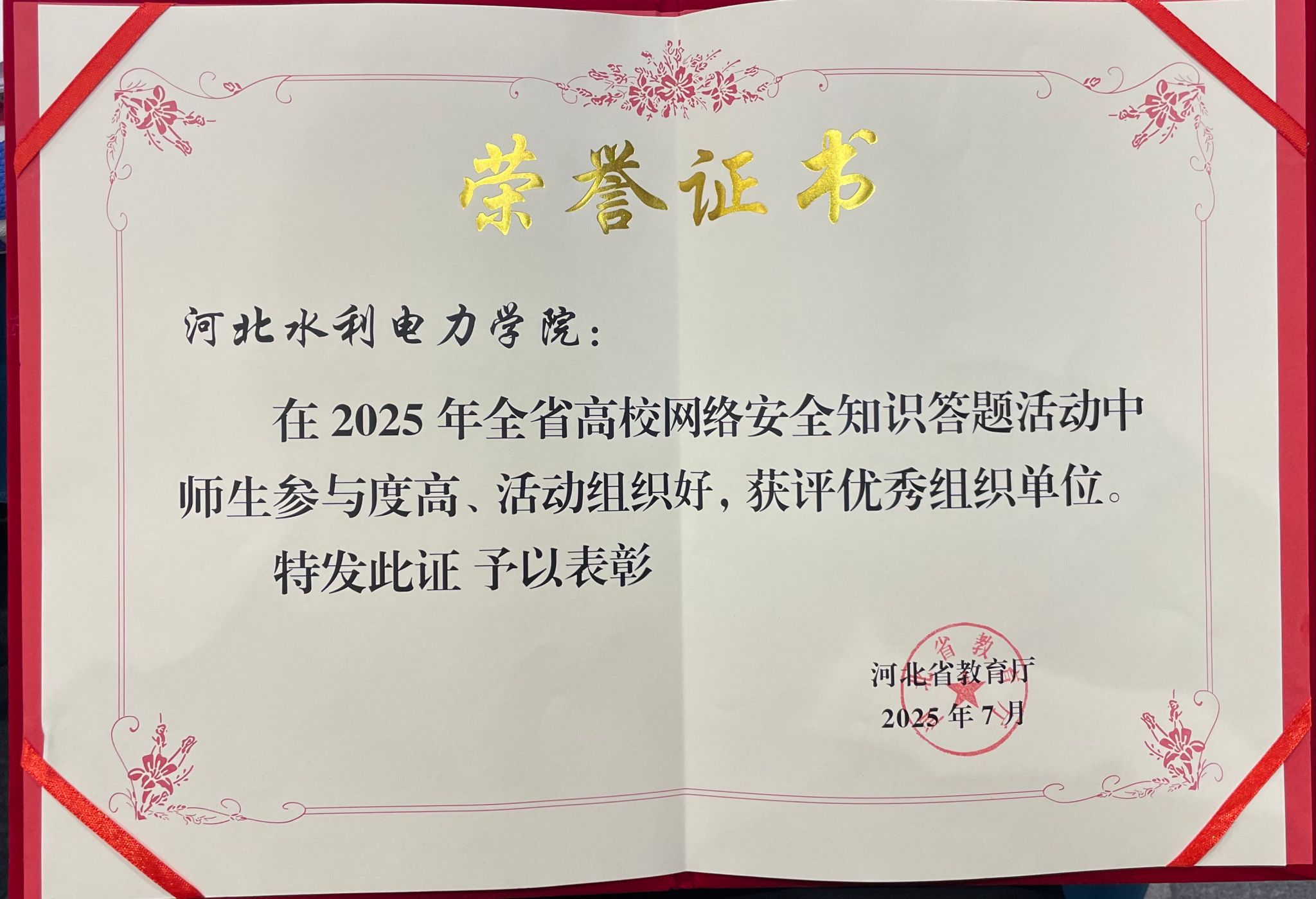 7月16日,在河北省教育厅举办的全省教育系统网络安全学术研讨班开班式上,我校凭借在网络安全知识答题活动中的出色表现,荣获“优秀组织奖”荣誉。